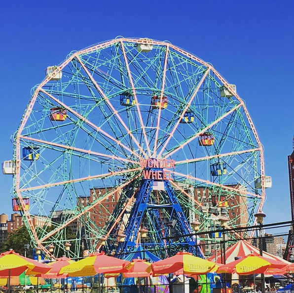 At the time it was built, in 1918 (it opened in 1920), the Wonder Wheel was the tallest ferris wheel in the world! (I believe the London Eye holds that record now.) It has two types of cars. The white cars are stationary. The red and blue cars swing along a track as the ferris wheel moves.
